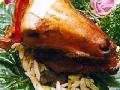 1.选用2至3龄也称“四六口”的内蒙古产的山羊头(是被阉割过的公头号,俗称羯羊,这种羊头,肉嫩而不膻,能切出又薄又大的肉片),放在冷水中浸泡2小时,用板刷反复刷洗头皮,刷得越白截止好(但不要将皮刷破)。再把羊嘴掰开,用小毛刷探进口内刷洗口腔,并在水内来回移动着刷洗,将口、鼻、耳内的脏物刷出,然后换新水再洗2次。沥净水,用刀从头皮正中至鼻骨划一长口,以便于煮熟后拆骨。