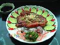 做法:(1)将三文鱼片对折后卷拢成花朵状,置于盆中,挤上柠檬...
