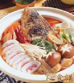 4.再放入鱼头、香菇、大白菜、鱼板、竹轮与作法3的料一起煮,煮约20分钟后,整个倒入砂锅中,并放入冬粉,再把青蒜丝放到鱼头上。