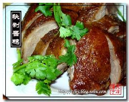 6.酱鸭晾凉后,将肚中的香葱节取出扔掉后,将酱鸭切件装盘就行了^_^