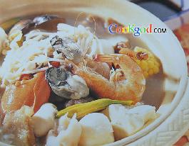2、鱿鱼去皮切花刀片,玉米切小段,备齐火锅料后,将锅子盛装1材料置于加热器具上,煮开后放入火锅料即可。