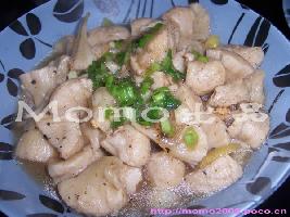 做法:1.将鱿鱼剞十字花刀,切成6×3.3厘米的长块,下沸水锅氽...
