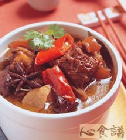 4.另起一锅,锅烧热后倒入10㏄的沙拉油,加入蒜头及作法1的葱、姜片、辣椒片爆香,再加入所有药材及调味料略为翻炒,再依序加入作法3的羊腩肉及作法1的红萝卜、白萝卜翻炒1分钟后,加入水及甘蔗头,将锅盖盖住,开小火焖煮约1.5小时至羊腩肉质变软,最后傻撒上香菜即可。