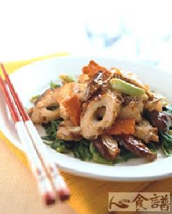 做法:1、将仙人掌、百合、胡萝卜切成菱形片、一同入沸水焯...