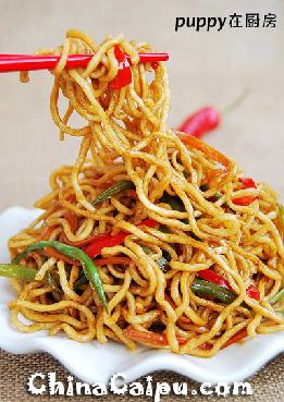 6.下入面条翻炒均匀,如果这时觉得颜色浅就再倒老抽;然后倒入热水,大约到食材的1/2处,翻炒,可以直接用筷子挑散,中间也可以盖会儿盖子,一直炒至汤汁收干。这时可以尝一尝,如果觉得淡再加盐调味。