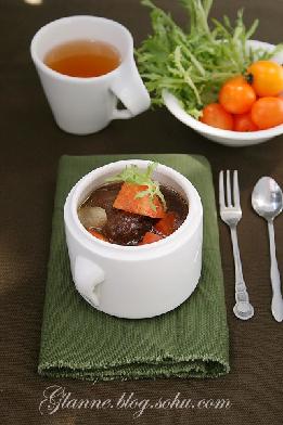 4.锅中汤汁减少到一半,用筷子扎牛尾感觉很柔软时,放入余下的洋葱、胡萝卜,加入盐,再加盖炖20分钟,或者汤汁收浓即可。