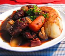 6.从烤箱中拿出装有bacon牛肉的casserole,倒入red wine和beef stock各1-2 cups至差不多淹没牛肉,放入一大勺tomato paste或者番茄碎儿,丢入调料包,整个放入烤箱烤2-3个小时左右。(在最后半小时我把炒好的胡萝卜和洋葱也丢进casserole同烤了)