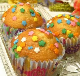 九、预热烤箱200--225F,烤盘放入小杯纸,倒入面糊7成半至8成满,撒上装饰小粒粒,200--225F烤18--20分钟。