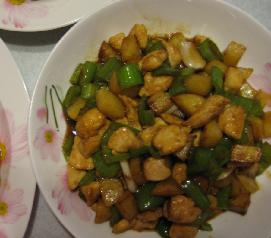 5. 另起锅烧热,放适量油,六成热的时候放入鸡丁滑炒,稍微变色后放入葱花和蒜片,再翻炒几下后加入事先炒好的土豆丁和青椒丁,烹入调味汁,翻炒至收汁;