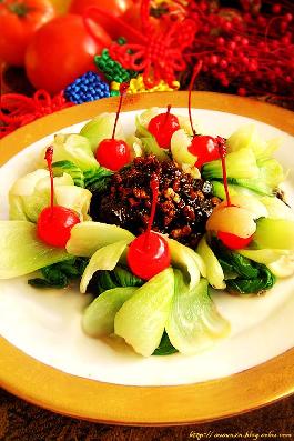 7.装盘是用油菜和樱桃做的,油菜用热水加入少许油汆烫,过凉水,沥干后,然后取多根油菜叶,组成花朵装,中间用樱桃做花芯就可以了。