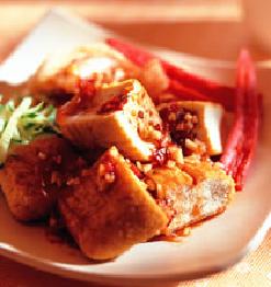 做法:1.将豆腐放入120℃油锅中炸约2分钟后捞起;鱿鱼切片备用...