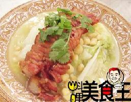 2.取一个蒸盘先舖上大白菜,再摆上珠贝和腊肉片后,移入蒸锅内以大火蒸20分钟,再起锅将汤汁沥出倒入锅中后,加入干贝粉、盐和胡椒粉调味,再淋入太白粉水勾芡,淋在蒸好的腊肉蒸白菜上,再撒上香菜即可完成
