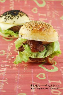 1.汉堡包面包胚制作:按照一般做面包的方法,把所有材料混合后揉到能拉出膜的扩展阶段,在28度环境内做基本发酵约1小时,发酵到2.5倍大。用手沾面粉按发酵好的面团,不回缩即发酵完成。