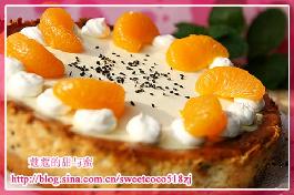 7.将125克酸奶油与20克糖搅打均匀,并倒在凉后的芝士蛋糕内凹下去的地方。再放入已160 度预热的烤箱里,烤8分钟左右看表面酸奶油凝固即可取出。注意不要把酸奶油烤出棕色斑 点以免影响美观。
