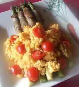 5 当鸡蛋液刚刚开始发稠时,即刻关火。加入1中的mini西红柿,用gum棒搅和,传些热给mini西红柿。放在3上,完成。