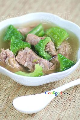 3)砂锅中一次性倒足清水,大火加热沸腾后,倒入排骨,料酒,葱段和姜,加盖用文火煲40分钟之后,倒入苦瓜块,继续煲10分钟。食用前根据个人口味调入少许盐即可。