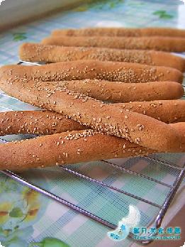 2.将发酵好的面团稍揉去掉空气,分割成小分滚圆盖上保鲜膜松弛10分钟。取一个面团搓成长条形,沾上芝麻,放到烤盘上。
