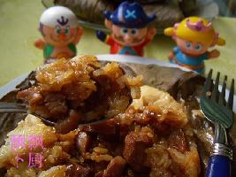 4.干荷叶泡软,用软布轻轻擦洗干净,去掉中间的硬蒂,裁成八等份,视你要包的大小而定,摊开一张裁好的荷叶,中间铺点糯米饭,挖坑填入炒好的馅料,再在上面盖上薄薄一层糯米饭,把它包成方块状,长包状随你。