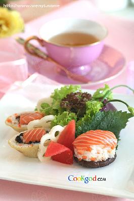 6)另一个造型的寿司很简单。将香菇焯烫一下后,放在盘中,用手将米饭团成团,放在香菇上面,再盖上一块三文鱼片。