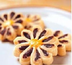 5.将醒好的油酥皮再桿成扁圆形,包入豆沙馅,收口的地方要密合,再压平,用剪刀平均剪成10瓣的花瓣,间隔排入烤盘,中间刷上蛋黄液,以上火170℃、下火160℃的温度入炉烘烤,烤约20~25分钟即可。
