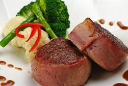 4.将作法4的菲力牛排放入200℃的烤箱,烤约三分钟至牛排呈七分熟,即可取出摆至作法2的盘中。