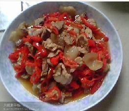 做法:(1)里脊肉切片加调料拌匀,冬菇,玉兰片,泡红辣椒也切...