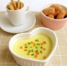把蔬菜洗净,切块切段,并用开水烫一下,然后连同鳕鱼一起放入搅拌机中打碎 ,打的时候加适量清水或高汤