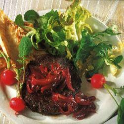 9.蘑菇香豆饼排放在餐盘中,浇上红洋葱酱汁,与面包及蔬菜沙拉搭配食用。