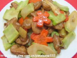9.待鸡肉炒到5分熟后,依次放入胡萝卜,西兰花片,笋片,翻炒2分钟后,倒入适量的料酒,一定要放一点醋这样可以让西兰花片吃起来很脆.调入一点盐,糖,味精就可以出锅了。