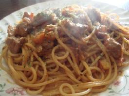 5.就将把煮熟的义大利面条放入拌匀,让肉酱均匀的佈满面条即可装盘,食用时撒上起司粉,巴西里。