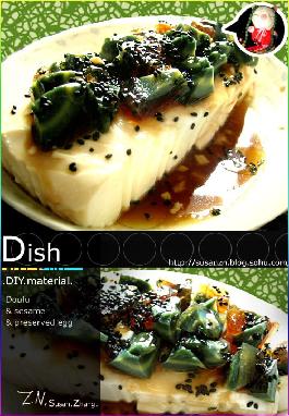 4.放调料。把松花蛋放在豆腐上,加入少许生抽,醋一点点(豆腐不适合放醋,放在松花蛋上可以),蚝油,鸡精,大量的盐,香油,撒上芝麻。