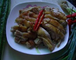 7.消毒砧板,待鸡稍冷却后切块,再取原汤淋上,配以消毒香菜伴边即成。