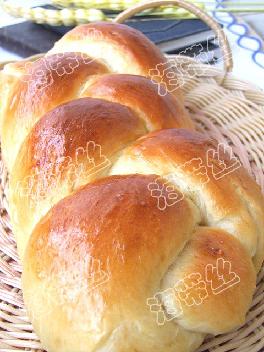 3.发酵好的面团取出,分割成3分,每分大约160克左右将3分面团搓成3跟长度差不多的面条,其中一端将三根面条捏拢,捏紧,然后象编辫子一样,把三根面条编成一根辫子,收尾处再次将三根面条捏拢,捏紧