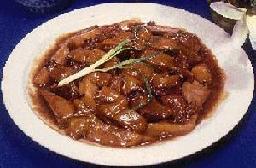 5)净炒锅加花生油少许,放中火上烧六成热(约150℃),加葱段、姜片、花椒炸至呈金黄色时捞出,倒入鸭锅内;鸭上面扣上盘子,用小火煨1小时左右,揭去盘子,提出锅垫,用平盘托着扣入大盘内,揭去锅垫;锅内汁用淀粉勾流水芡,浇在鸭方上即成;