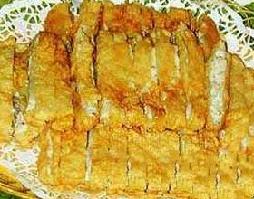 4.猪肥肉膘片成长6厘米、宽4厘米的薄片4片,用打好的糊逐个抹上;