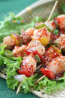 3)用竹签将鸡块,洋葱块和青红黄椒块,按照你喜欢的排列顺序串在一起。