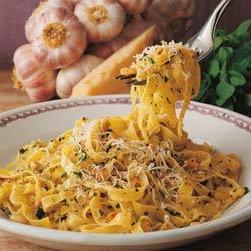 5.面条沥干,装进大碗,倒进剩余的橄榄油,拌匀。然后拌入调好味的松子仁面包屑。巴马乳酪可以撒在面条上,或放在另一个碗内上桌。