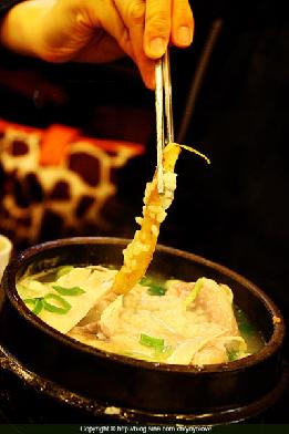 做法:1.烤鸭切下胸肉的部份,并切薄片后再切丝;猪网油以冷...