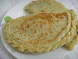 7.把韭菜末放在面然后象包油角一样,把边折成好看的花.片的一边,洒点盐,然后对折,把边压实(以防漏馅)