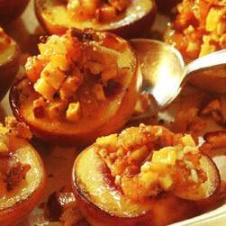 3.切碎的杏仁和水果杏泥饼馅料拌在一起。拌匀后,填满桃子中间的凹坑,堆高后轻轻压紧,然后用铝箔纸松松地盖住烤盘。