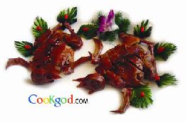 3、锅置火上,烧至七成热时放入白糖、小米、茶叶小火翻炒10分钟,铁架架在锅里并放上乳鸽盖上锅盖后用冒出的烟熏5分钟取出,斩成重15克一个的块,再拼成乳鸽形,用黄瓜片、枸杞、兰花装饰即可。