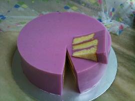5.过滤绿豆粉浆,倒入前要再拌均一次才倒入,倒入后马上拌均,因为很快就会稠掉,浓稠状后熄火,一层yam层一片蛋糕至8寸蛋糕模内,做完为止。