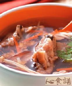 6.金针菇去蒂、洗净,和笋丝、黑木耳丝、红萝卜黑木耳丝一起放入滚水中汆烫至熟,捞出后放入高汤中以中大火煮至滚开,加入调味料C、柴鱼片、油蒜酥续以中大火煮至滚沸。
