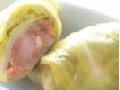 3.将所有材料2混拌均匀成馅,先在高丽菜叶上涂一层薄薄的太白粉,再取适量馅包入,卷起成椭圆状,接缝处用牙签固定。