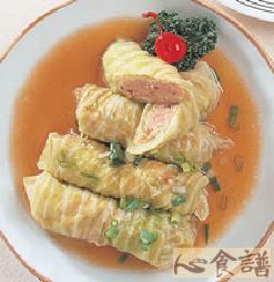 4.将作法2的馅料分别包入高丽菜叶,排入盘中,淋上调匀的调味料C,放上香菇片及红萝卜末,以强微波加热7分钟后,再改以中微波加热8分钟即可。