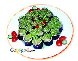 2、肉馅加入盐3克、生抽、味精3克、糖、葱末、姜末调味后分成10份,茄子墩内拍上生粉,将肉馅酿入其中,按平,然后将茄子墩放入蒸笼中大火蒸8分钟,取出备用。