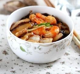 4、将煮肉的肉汤沥清倒入锅中,煮沸后放入葱、姜末少许,肉片,香菇、木耳煮约十几分钟,放入虾仁、黄瓜片;