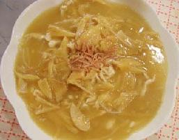 5.锅中烧热1大匙油,先爆香葱段和2片姜,再倒入1大匙黄酒和2杯高汤煮滚后,先捞出葱和姜,再放入拆成小片的鱼翅煮滚后,淋入1大匙太白粉水芶芡,再加入蚝油,起锅淋在鸡丝上,最后撒上火腿丝就完成今天的这一道鸡丝烩翅了