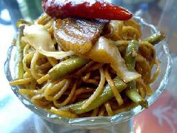 3.倒入切好的莲花白丝和豆角,翻炒约1分钟后,调入酱油,盐,鸡精,拌炒均匀.(做好后面会因为酱油的调色而特别漂亮,看起来就非常有食欲)
