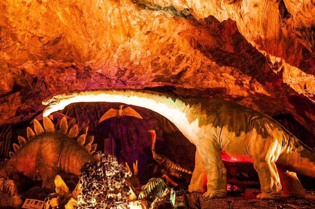 旱洞内各种恐龙雕塑栩栩如生,有霸王龙、三角龙、深林龙等等。在幽暗的灯光下增添了无限的美感与神秘。